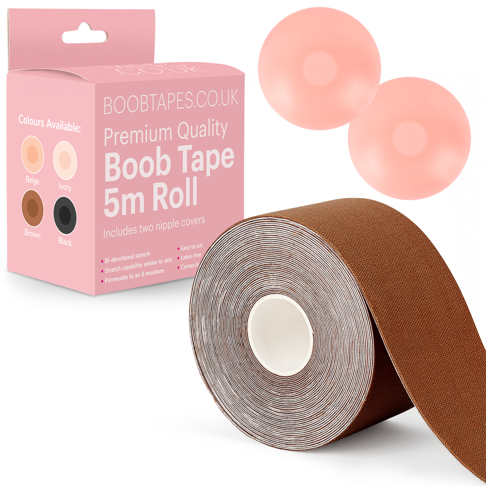Our Boob Tape is 16.4 feet (5 meters) in length and 2 inches (5 cm) in width. It comes with reusable silicone nipple covers that have a diameter of 2.8 inches (7 cm) and a thickness of 0.12 inches (3 mm).